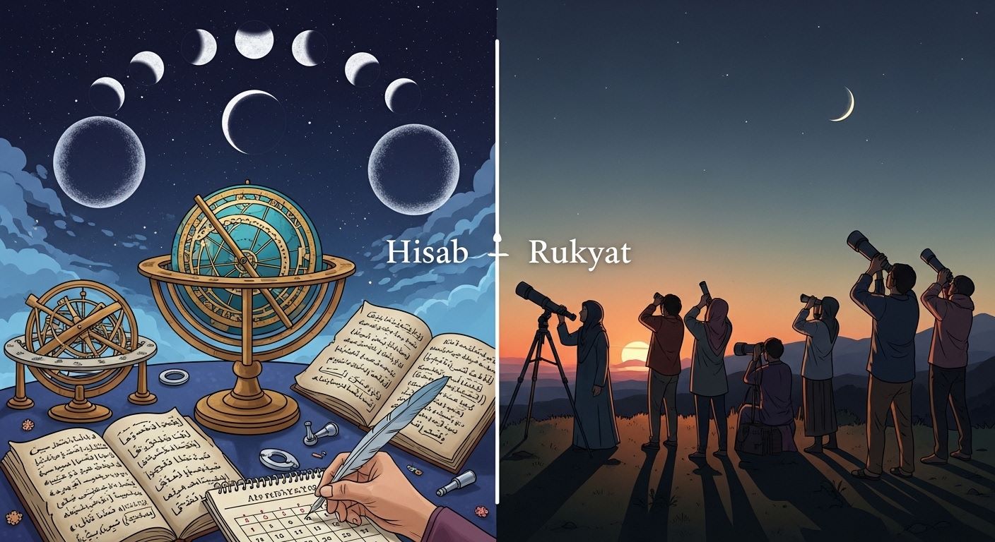 Secara sederhana, hisab adalah metode perhitungan astronomi untuk menentukan posisi bulan, sedangkan rukyat adalah metode pengamatan langsung hilal (bulan sabit pertama). Meski tujuannya sama, cara yang digunakan berbeda.