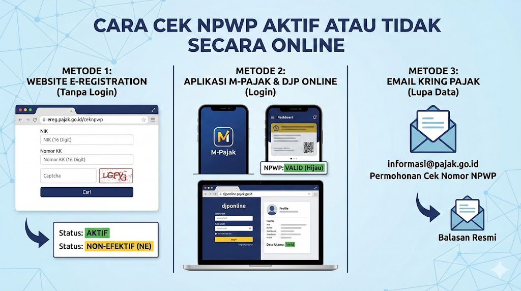 Untuk memeriksa status keaktifan NPWP, Anda dapat mengakses laman resmi ereg.pajak.go.id/ceknpwp. Masukkan 16 digit NIK sesuai KTP dan Nomor Kartu Keluarga (KK) pada kolom yang tersedia, lalu masukkan kode keamanan. Sistem akan menampilkan identitas, nomor NPWP, KPP terdaftar, dan status keaktifan (Aktif atau Non-Efektif) secara real-time tanpa perlu login.