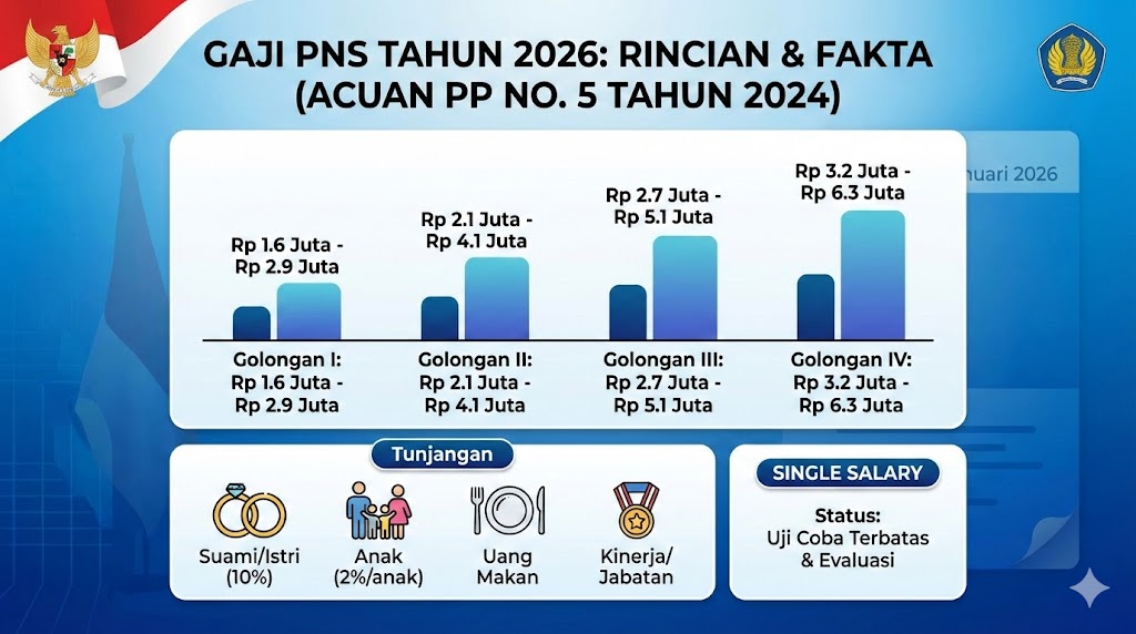Bagi Anda yang bertanya tentang kenaikan Gaji PNS Tahun 2026, jawabannya adalah nominal gaji pokok masih mengacu pada aturan lama (PP No. 5 Tahun 2024) kecuali ada keputusan presiden mendadak. Fokus pemerintah tahun ini lebih banyak tersedot untuk program prioritas nasional lain, sehingga skema Single Salary pun masih berjalan perlahan. Meski demikian, kepastian jadwal THR di bulan Maret dan Gaji ke-13 di bulan Juni tetap menjadi jaring pengaman finansial yang bisa diandalkan.