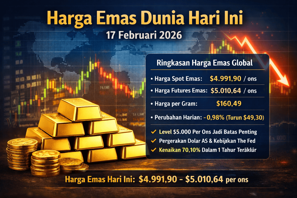 Harga emas dunia pada 17 Februari 2026 berada di kisaran $4.991 hingga $5.010 per ons, menunjukkan stabilitas dengan kecenderungan melemah tipis. Level $5.000 per ons menjadi batas penting yang menentukan arah pergerakan harga selanjutnya.
