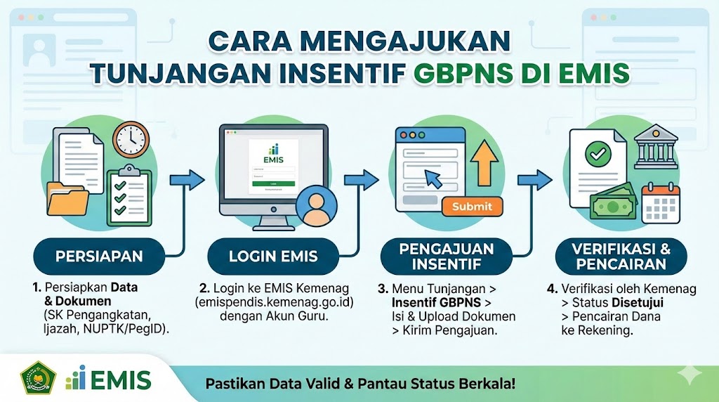 Pengajuan tunjangan insentif GBPNS dilakukan melalui alur resmi di EMIS dan melibatkan peran operator madrasah.