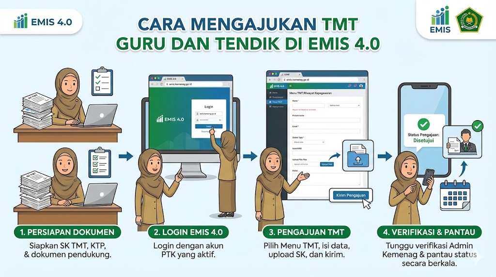 Pengajuan TMT dilakukan melalui fitur resmi yang tersedia di sistem EMIS 4.0. Proses ini harus dilakukan dengan teliti agar tidak terjadi kesalahan data.